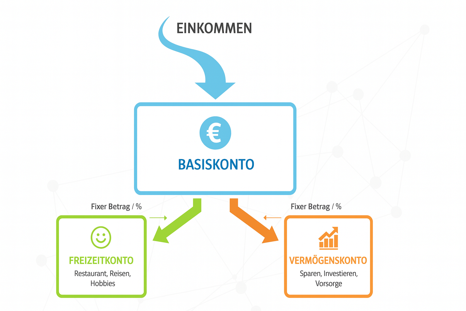 Das Fundament deiner finanziellen Ordnung besteht aus drei klar definierten Konten, die unterschiedliche Rollen übernehmen. Diese Trennung ist die Grundlage, damit dein Geld nicht nur verwaltet – sondern für dich arbeiten kann. Dabei geschieht die Überweisung auf die jeweiligen Konten automatisch am Monatsanfang, Monatsende oder Monatsmitte durch einen Dauerauftrag. Du trennst dein Geld in drei Lebensbereiche: